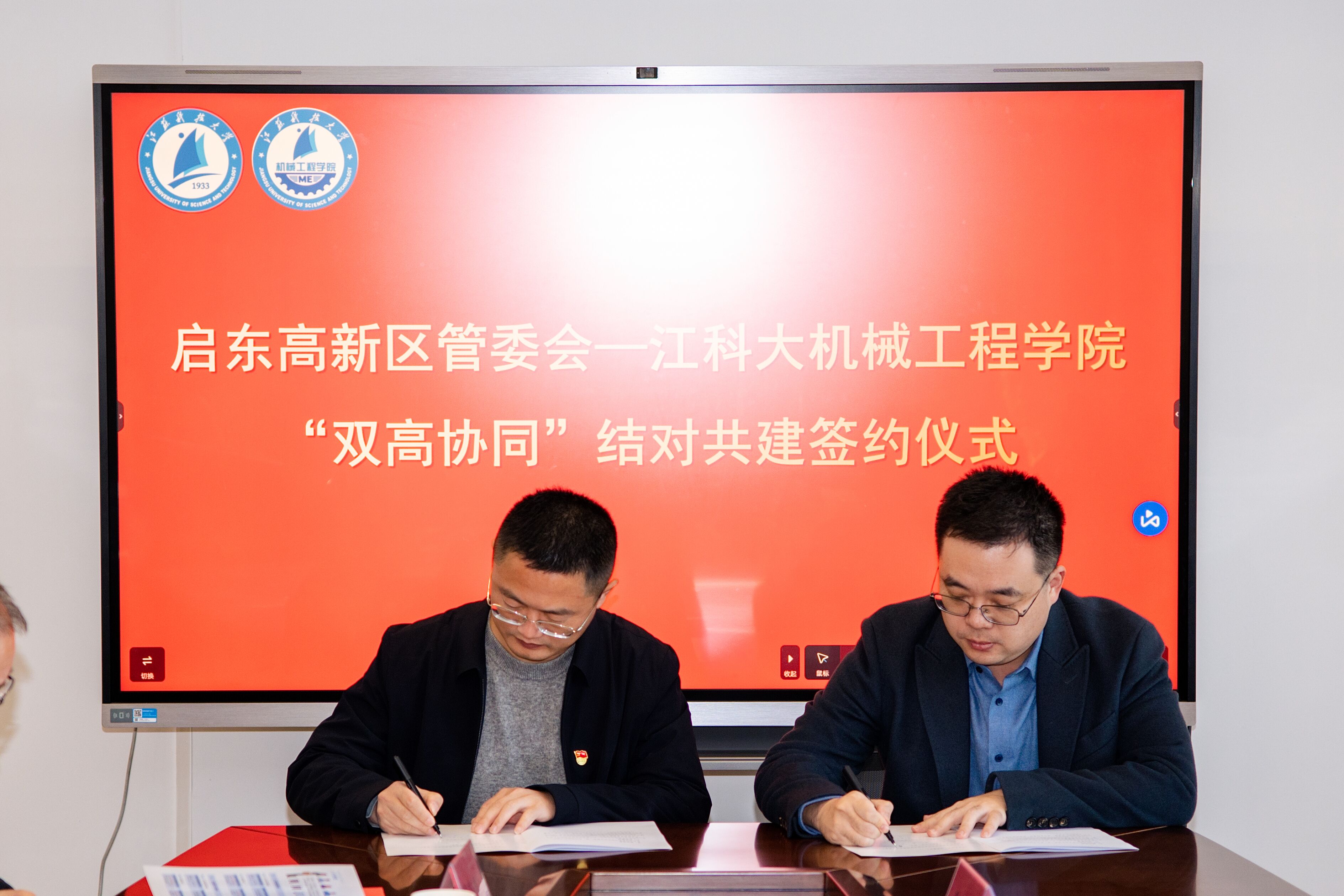随后,在双方共同见证下,张建和严隽逸代表双方签订了“双高协同”结对共建协议书,谭海波和琚健萍代表双方党委签订了“党建共建”协议书。同时,启东高新区聘任我们党员教师殷宝吉、展铭为党员科技指导员,琚健萍副主任为两位同志颁发聘书。